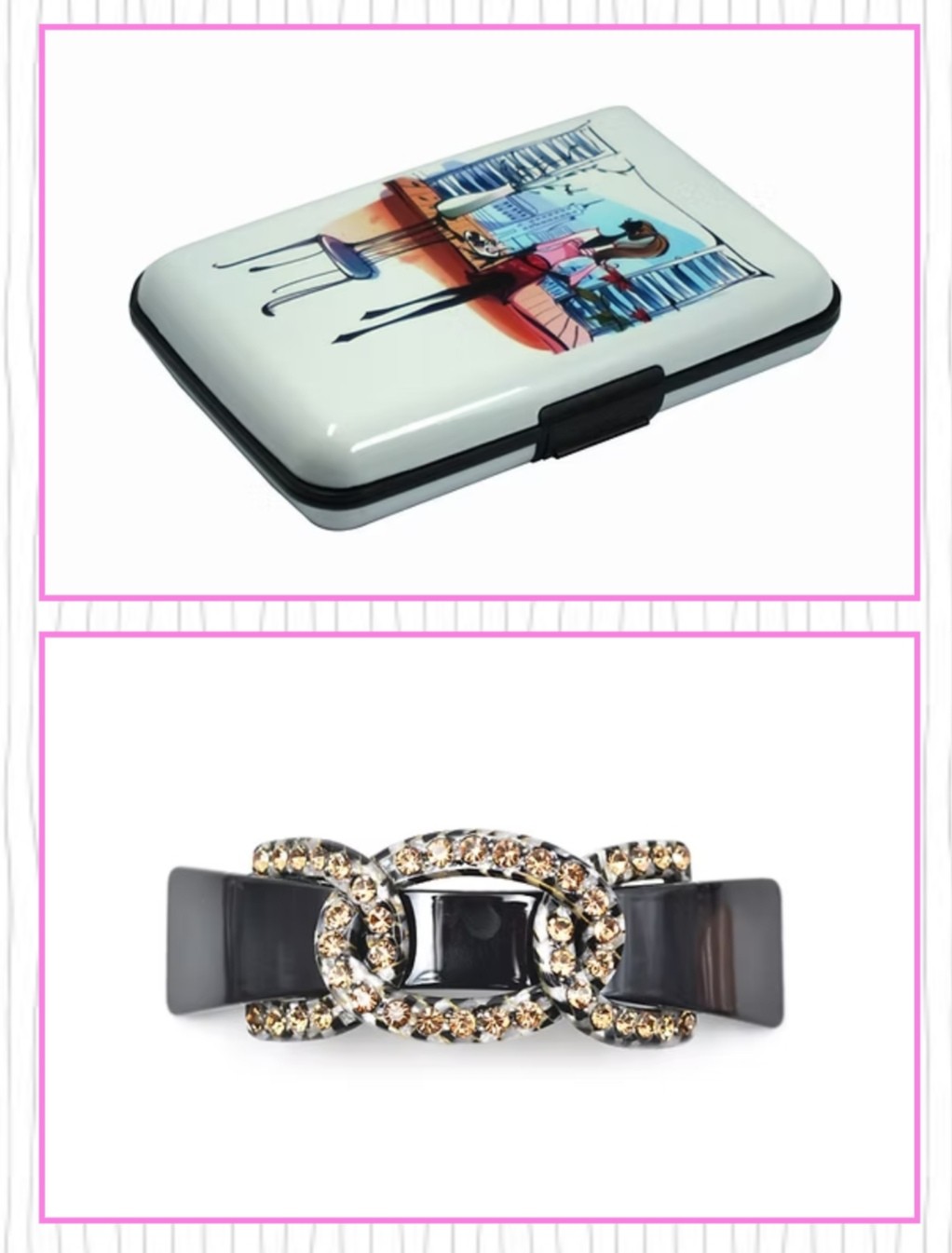 Lifestyle essential accessories for her with a Parisian theme. (Card holders, compact mirrors, cosmetic pouches etc, embroidered travel jewellery pouches, top quality hair barrettes
